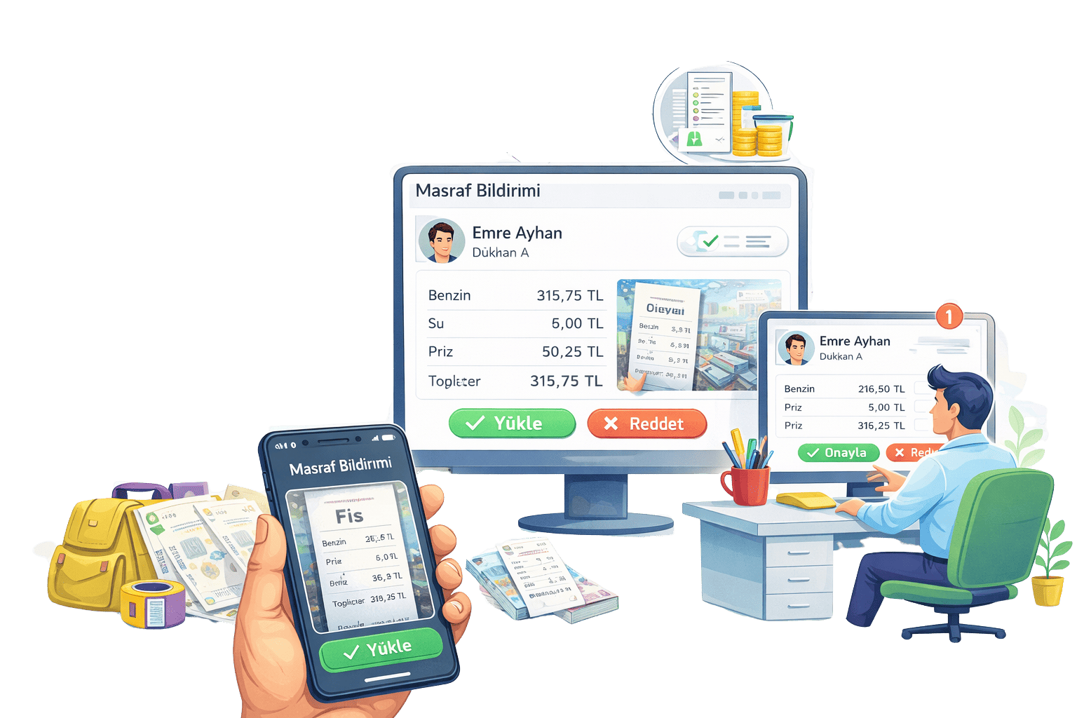 Çalışanlar yaptıkları harcamaları fiş veya fatura fotoğrafını çekerek sisteme kolayca yükleyebilir. Bu sayede seyahat, saha çalışması veya operasyonel giderler anında kayıt altına alınır. Kağıt toplama veya manuel raporlama süreçleri tamamen ortadan kalkar.