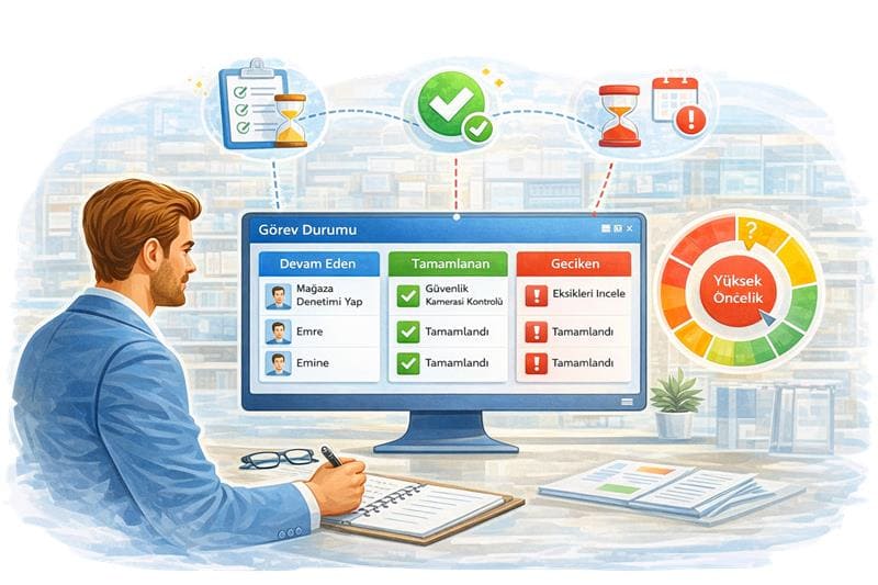 Görevler önem derecesine göre sınıflandırılarak önceliklendirilir. Devam eden, tamamlanan ve geciken görevler sistem üzerinden anlık olarak takip edilir. Bu yapı, yöneticilerin süreçleri daha kontrollü ve etkin yönetmesini sağlar.