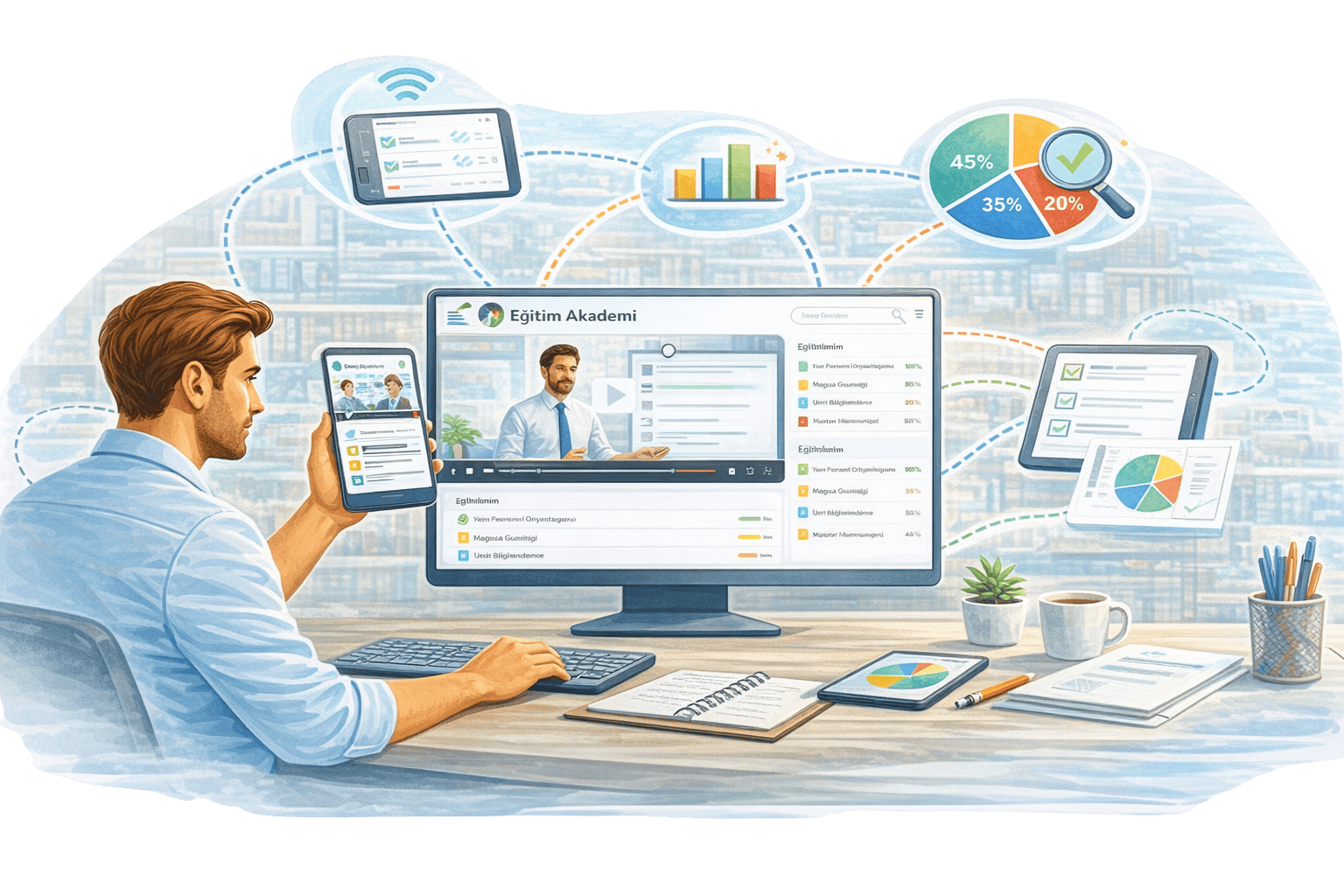 Personel gelişimini sistematik hale getirin, kurumsal bilginizi sürdürülebilir kılın. Emles Eğitim Akademi, işletmelerin mağaza ve saha ekiplerine yönelik eğitim süreçlerini uçtan uca dijitalleştiren kapsamlı bir eğitim ve gelişim platformudur. Eğitim içerikleri mobil ve web üzerinden kolayca erişilebilir, personeller görev ve seviyelerine göre otomatik olarak eğitimlere atanır. Sınav, değerlendirme ve sertifikasyon süreçleri ile çalışanların bilgi seviyesi ölçülür ve gelişim sistematik olarak takip edilir. Böylece işletmeler hem standart hizmet kalitesini sağlar hem de kurumsal bilgi birikimini sürdürülebilir hale getirir.
