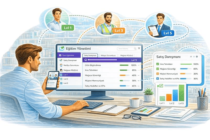 Eğitimler personelin görevine, pozisyonuna ve seviyesine göre otomatik olarak atanır. Satış danışmanı, mağaza müdürü veya saha personeli gibi farklı roller için özel eğitim setleri oluşturulabilir. Seviye bazlı yapı sayesinde çalışan gelişimi adım adım ilerler ve kariyer yolculuğu sistematik hale gelir.