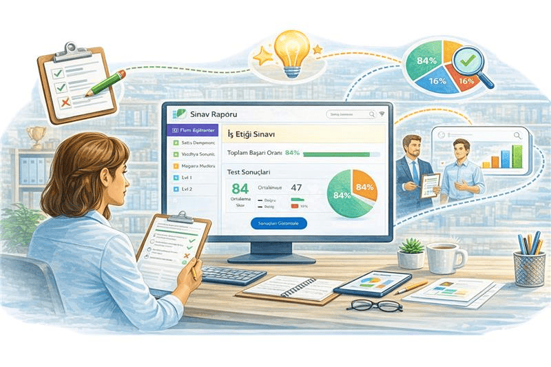 Eğitimlere bağlı sınavlar ile personelin bilgi seviyesi ölçülür ve sonuçlar sistem tarafından otomatik olarak değerlendirilir. Çoktan seçmeli testler, puanlama ve başarı oranları ile objektif bir değerlendirme süreci sunulur. Bu sayede yöneticiler çalışanların gelişimini somut verilerle takip edebilir.