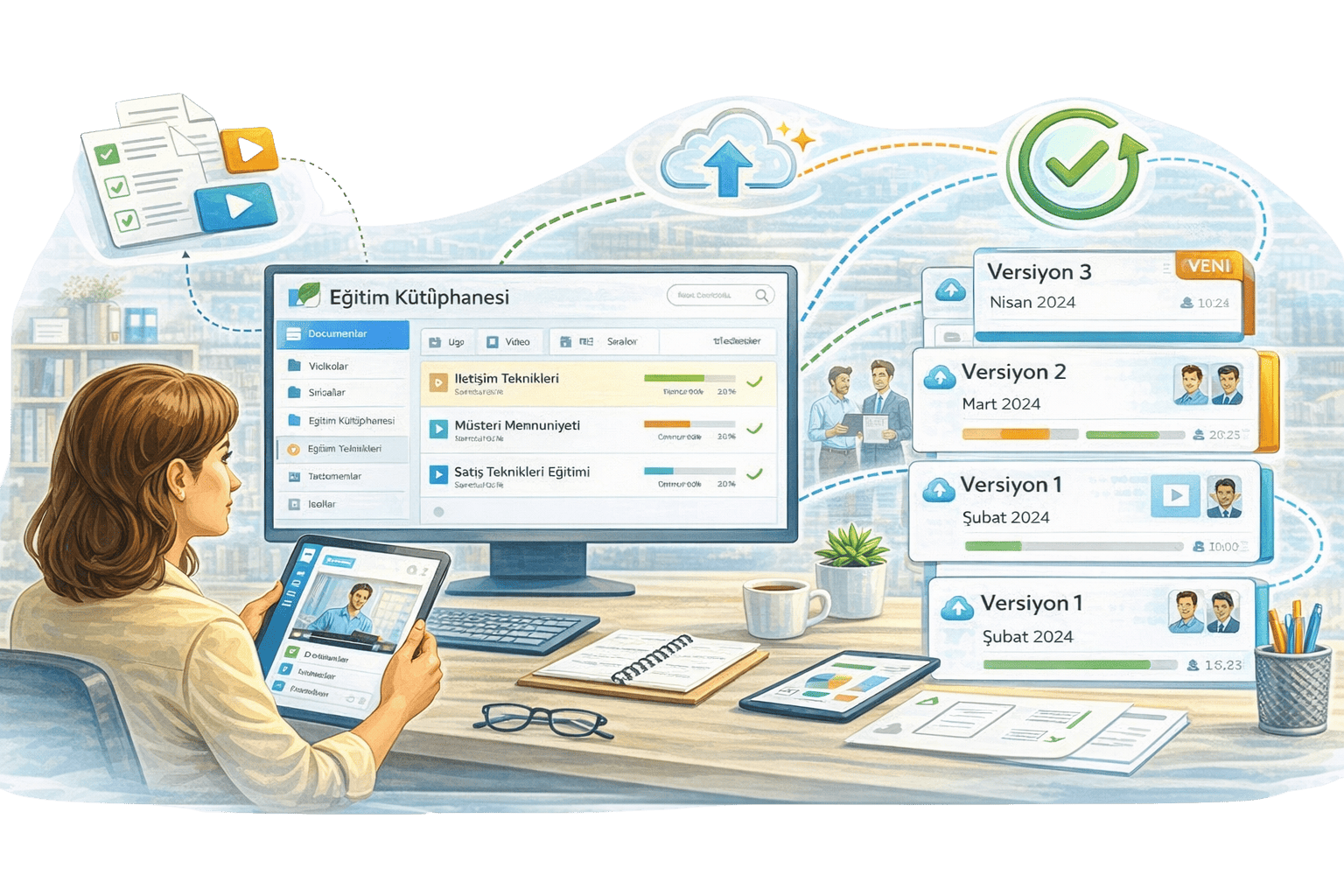 Eğitim içerikleri video ve doküman formatında sisteme yüklenebilir ve merkezi bir kütüphanede saklanır. Versiyonlama özelliği sayesinde güncellenen içerikler kayıt altına alınır ve hangi personelin hangi eğitimi aldığı takip edilebilir. Böylece eğitim süreçleri güncel, kontrol edilebilir ve sürdürülebilir hale gelir.