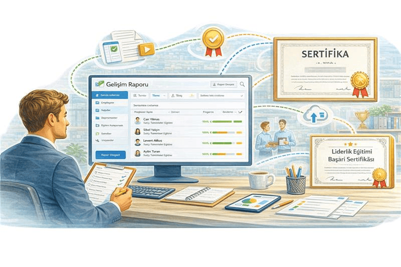 Personeller tamamladıkları eğitimler sonrası sertifika alabilir ve tüm gelişim süreçleri sistem üzerinde kayıt altına alınır. Ayrıca dış kaynaklı eğitimler ve belgeler de sisteme eklenerek bütünsel bir gelişim takibi sağlanır. Bu yapı, çalışan yetkinliklerinin belgelenmesini ve kurumsal gelişimin izlenmesini kolaylaştırır.