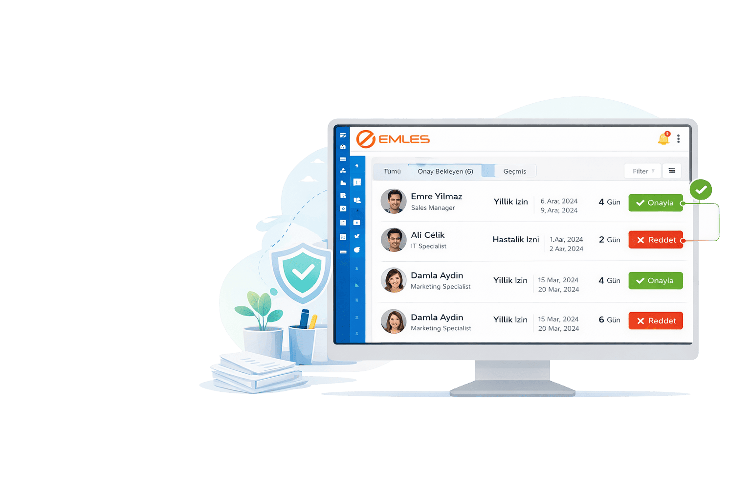 Yöneticiler kendilerine gelen izin taleplerini tek ekrandan görüntüleyebilir. Talep detaylarını inceleyerek hızlıca onay veya red işlemi gerçekleştirebilirler. Böylece izin süreçleri daha kontrollü ve düzenli bir şekilde ilerler.