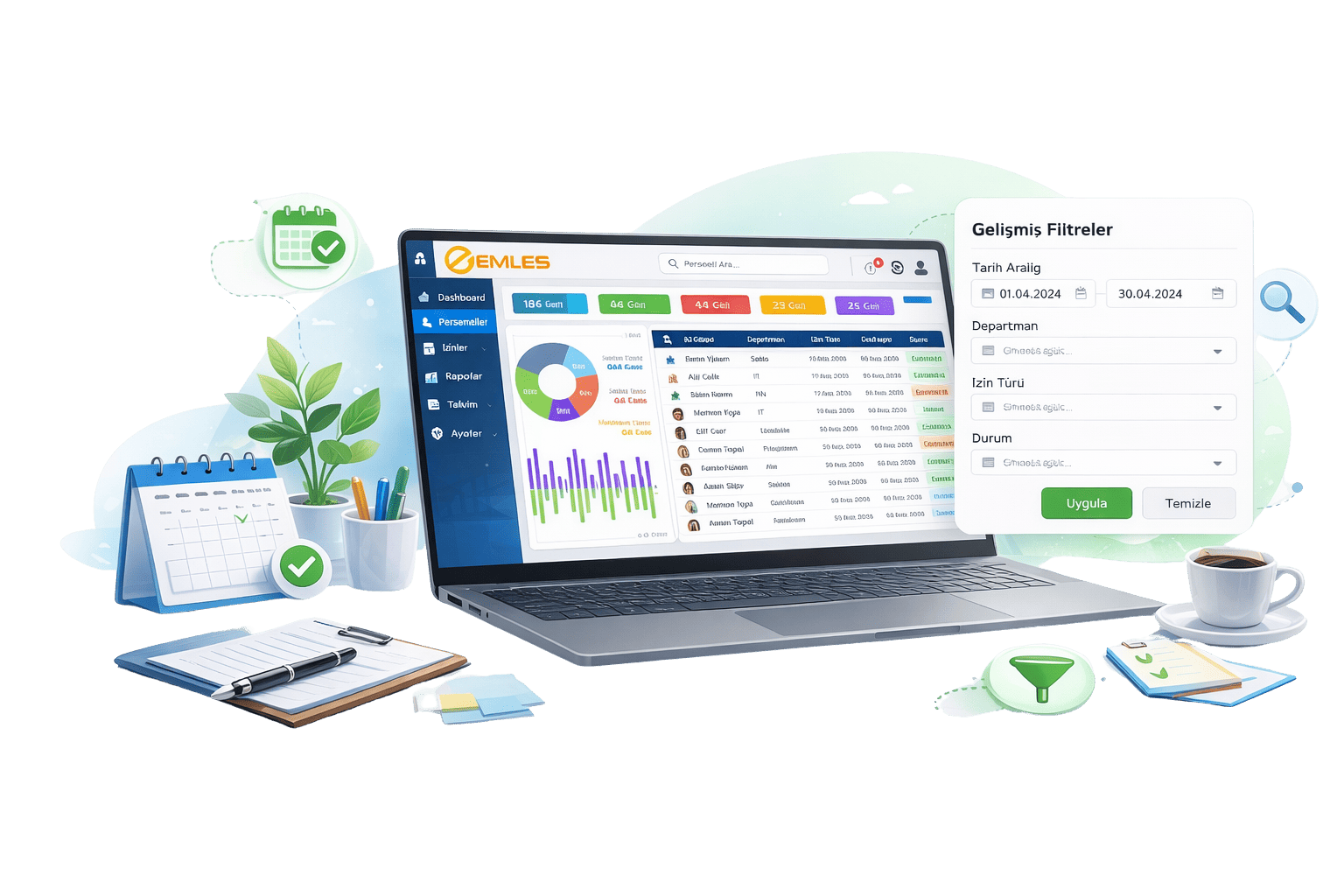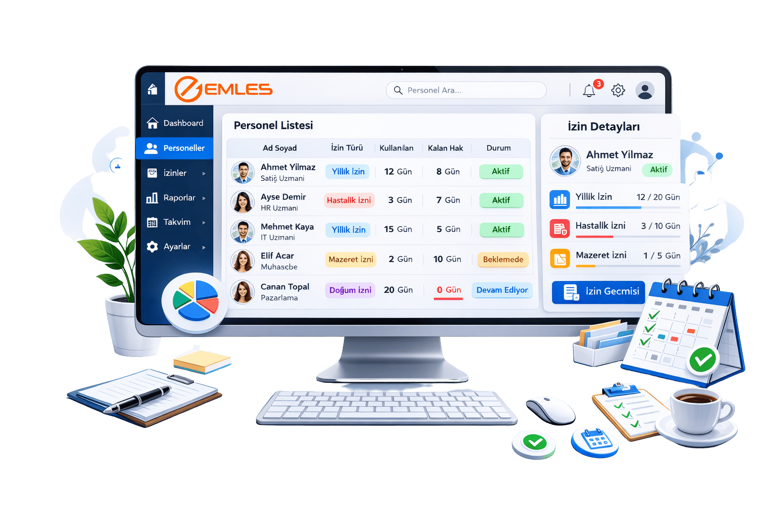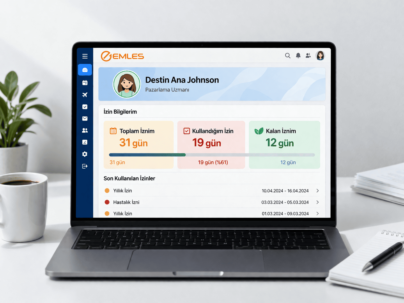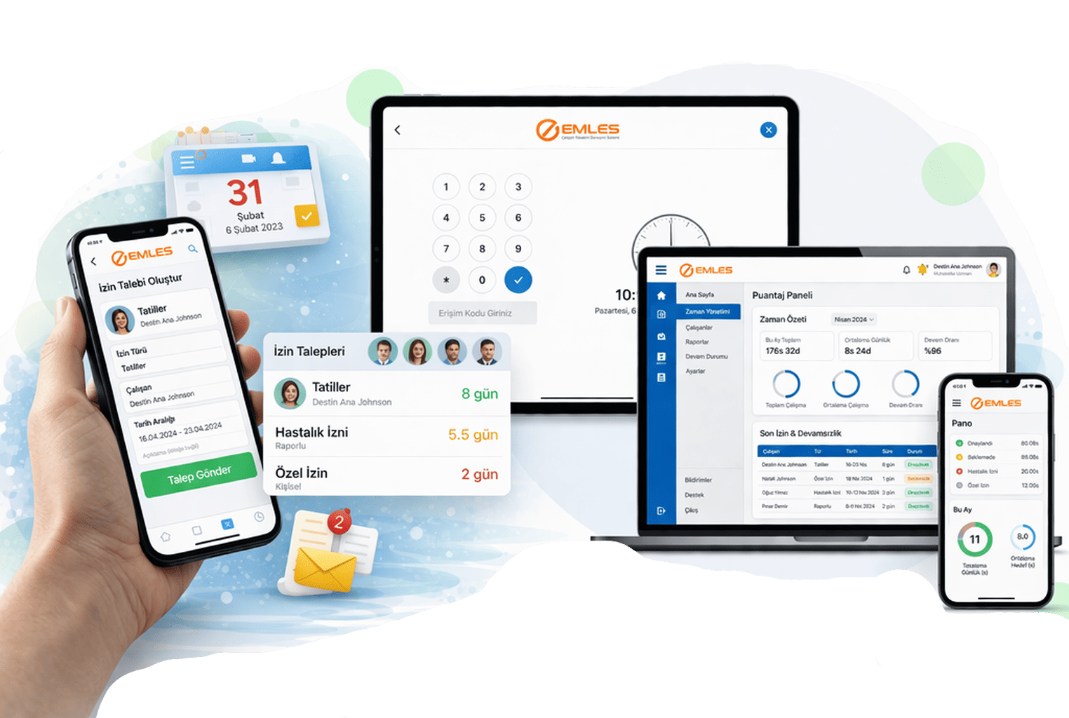 Emles, çalışanların toplam izin haklarını, kullanılan izinleri ve kalan izin bakiyelerini otomatik olarak hesaplar. Böylece yöneticiler ve çalışanlar izin durumlarını net ve güncel bir şekilde görüntüleyebilir. Bu özellik, izin planlamasını daha doğru, hızlı ve verimli hale getirir.