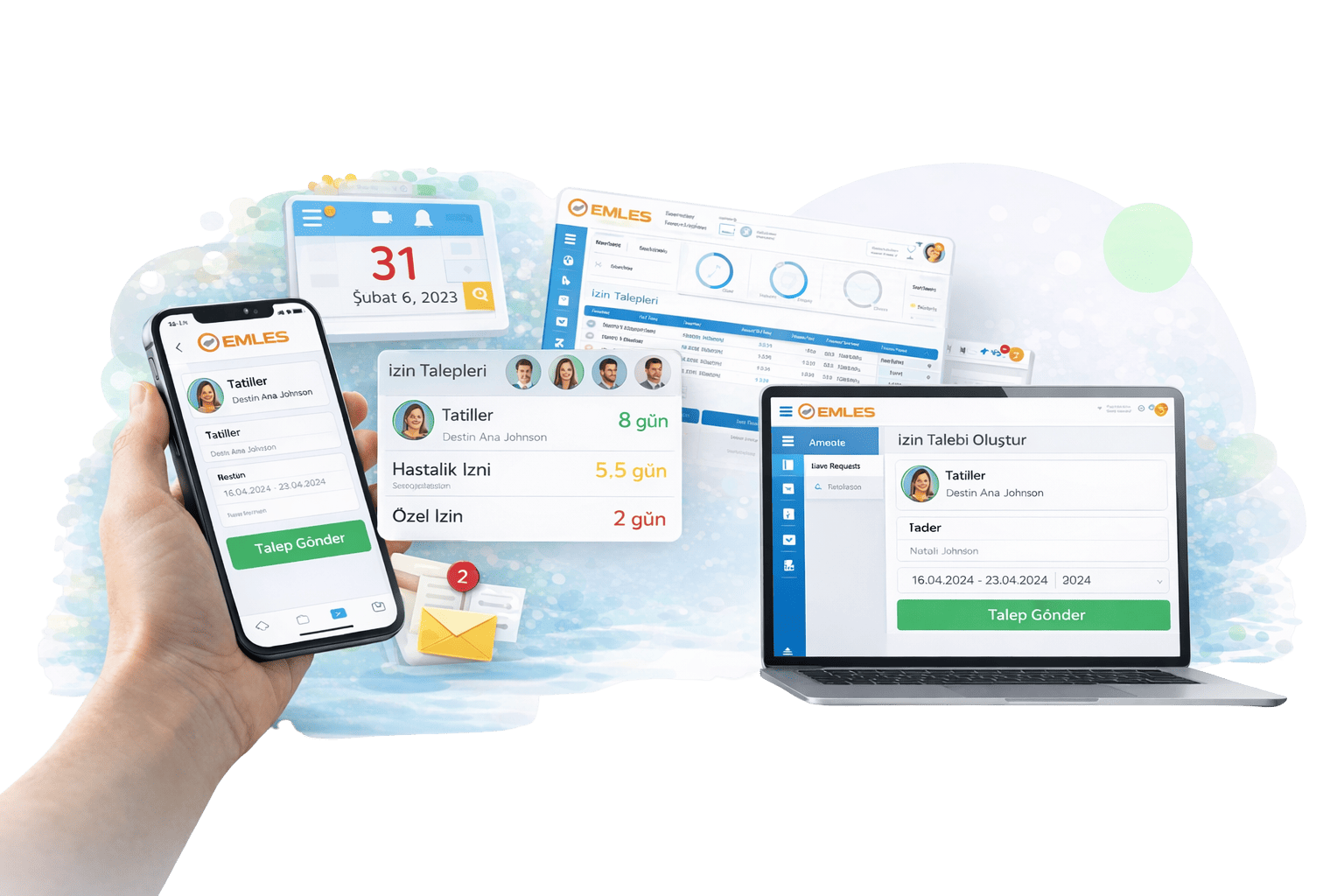 Çalışanlar izin taleplerini Emles mobil uygulaması veya web panel üzerinden hızlı ve kolay bir şekilde oluşturabilir. İzin türü, tarih aralığı ve gerekli açıklamalar birkaç adımda sisteme girilir. Böylece izin talepleri kağıt veya e-posta süreçlerine ihtiyaç duymadan tamamen dijital ortamda yönetilir.