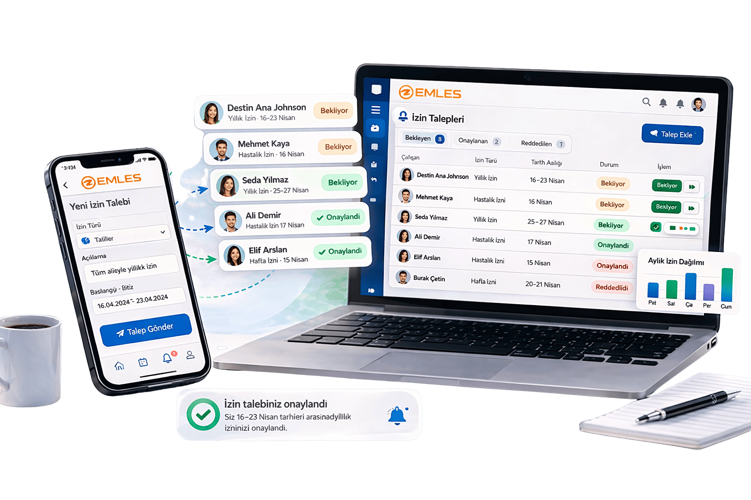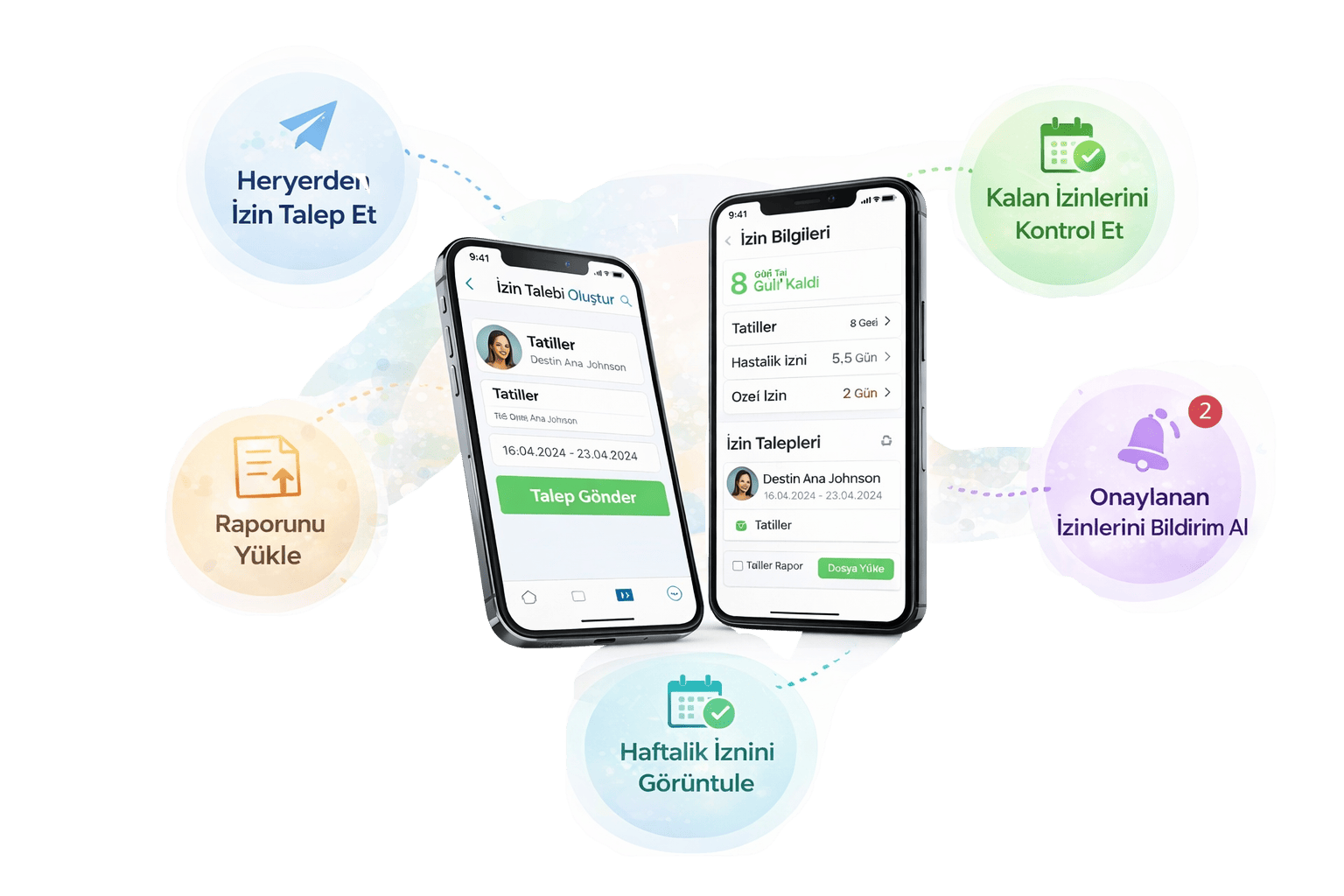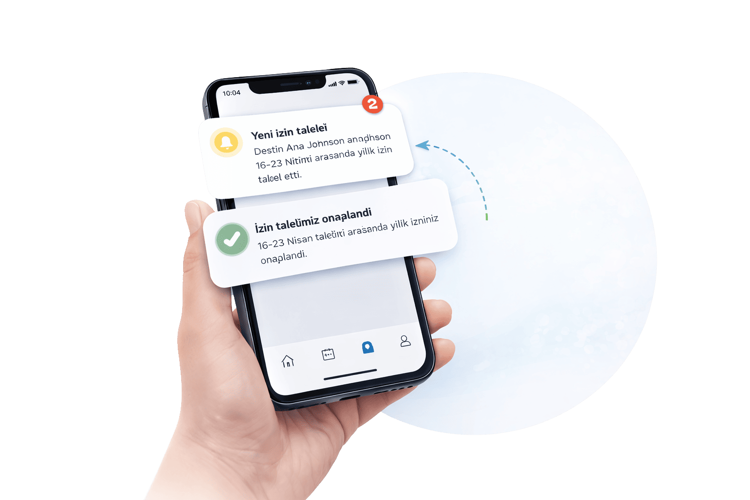 İzin talebi oluşturulduğunda ilgili yöneticilere anında bildirim gönderilir. Onay veya red işlemi tamamlandığında çalışan da süreç hakkında otomatik olarak bilgilendirilir. Böylece tüm taraflar izin sürecini anlık olarak takip edebilir.