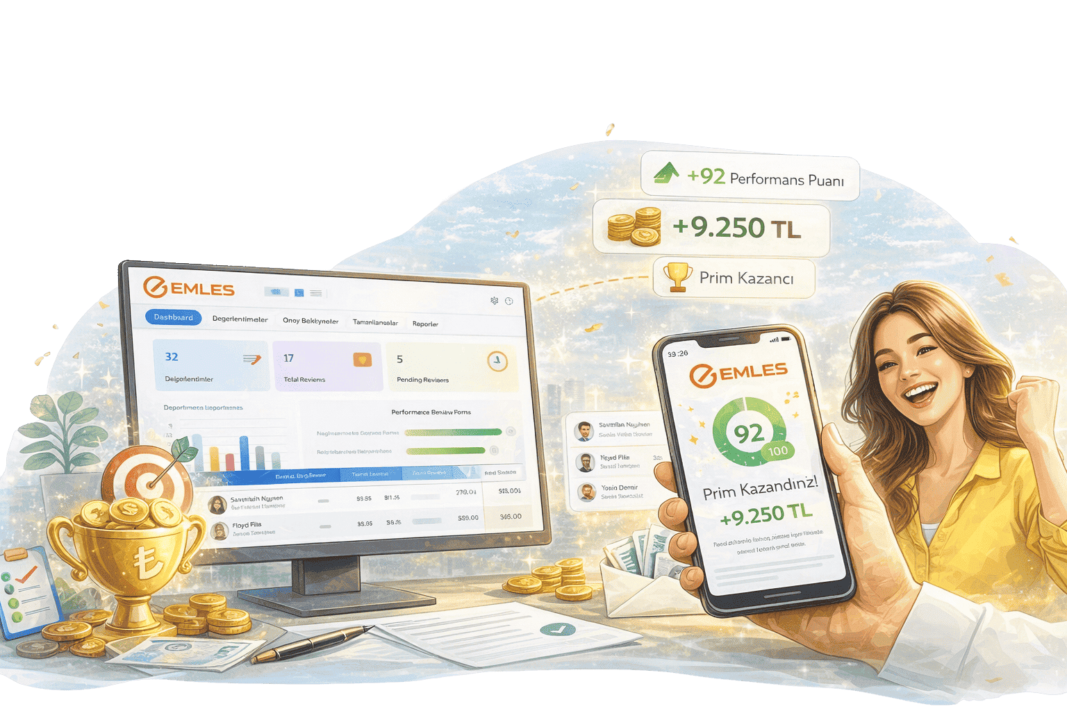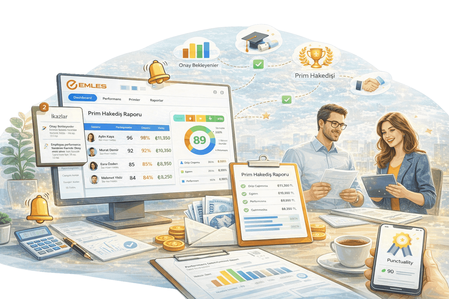 Emles Prim Yönetimi, işletmenize özel performans ve hedef kriterleri tanımlayarak prim hesaplama süreçlerini kolaylaştırır. Satış, ekip performansı, hedef gerçekleşmeleri ve operasyonel başarı gibi farklı kriterlere göre prim modelleri oluşturabilir, tüm hesaplamaları otomatik olarak yönetebilirsiniz. Böylece prim süreçleri daha adil, hızlı ve şeffaf hale gelirken çalışan motivasyonu ve işletme performansı artar.