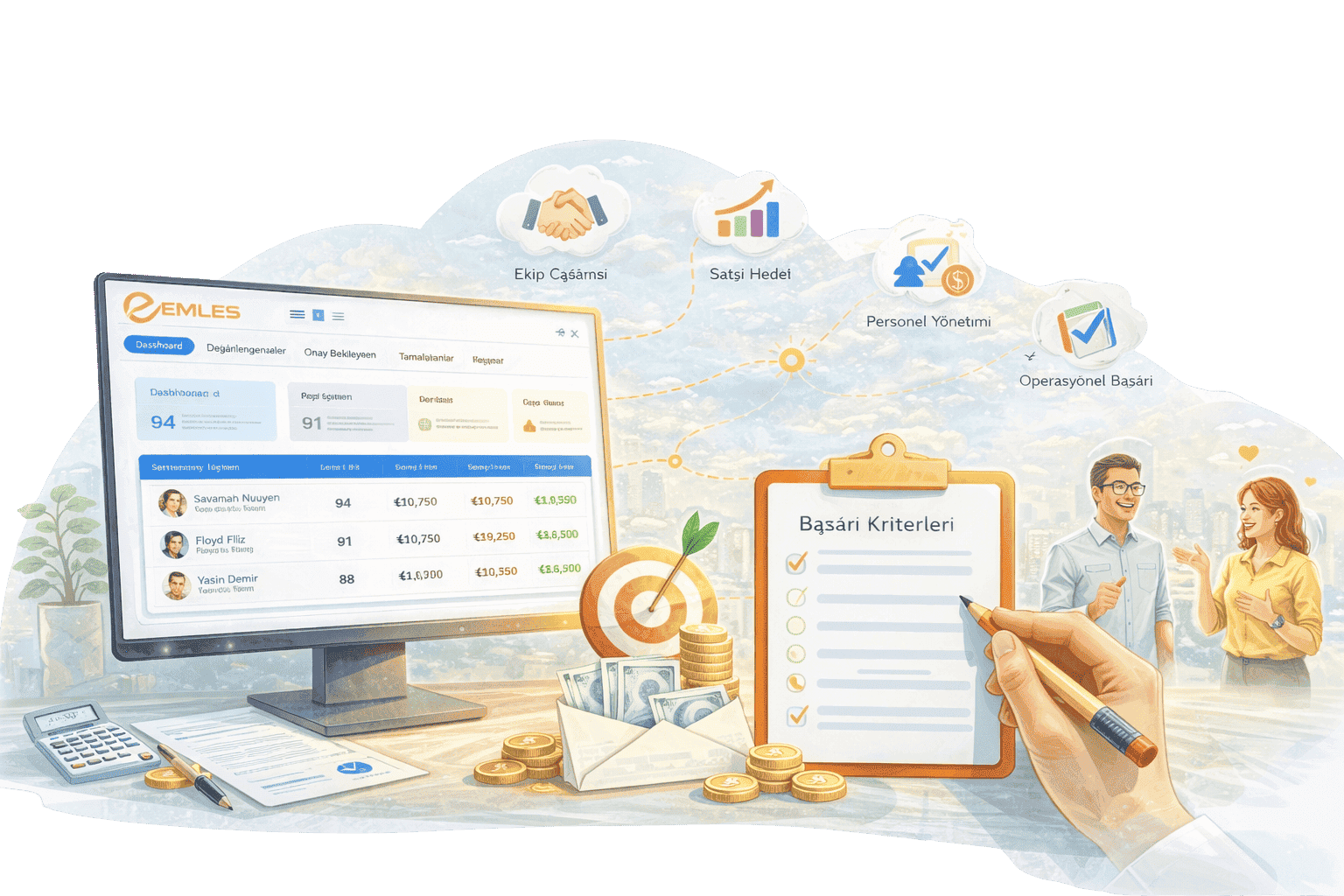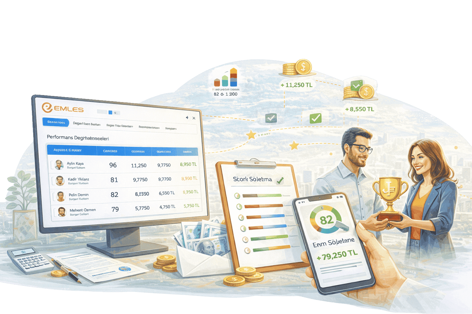 Emles Prim Yönetimi modülü, hedef ve performans bazlı prim sistemleri ile çalışanlarınızın primlerini hızlı, kolay ve hatasız şekilde hesaplamanızı sağlar. Satış, ekip çalışması, personel yönetimi ve operasyonel başarı gibi farklı performans kriterleri tanımlanarak çalışanların performansı sistematik şekilde değerlendirilir. İşletmenize özel kurallar ve başarı kriterleri ile prim hesaplamaları otomatikleştirilir, böylece süreç daha şeffaf, adil ve yönetilebilir hale gelir. Doğru yapılandırılmış bir prim sistemi çalışan motivasyonunu artırırken işletmenizin sürdürülebilir büyümesine katkı sağlar.