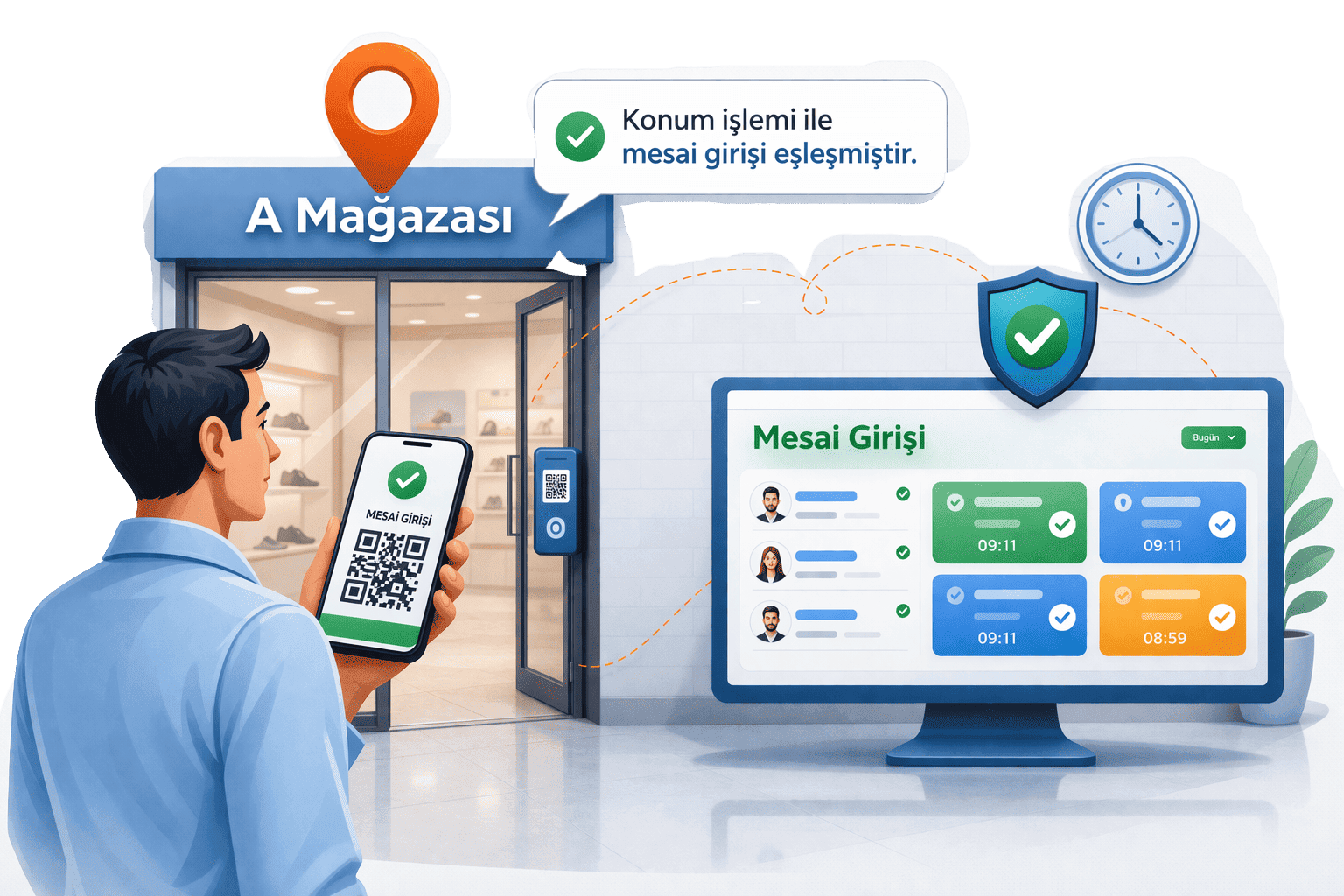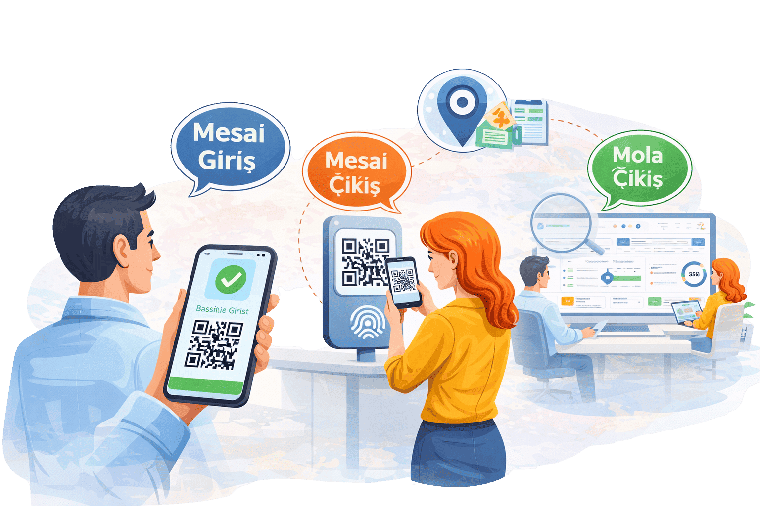Çalışanlar mobil uygulama üzerinden QR kod okutarak saniyeler içinde mesai giriş işlemini gerçekleştirebilir. Bu yöntem sayesinde kart, cihaz veya manuel kayıt gereksinimi ortadan kalkar. İşletmeler hızlı ve pratik bir mesai takip sistemi elde eder.