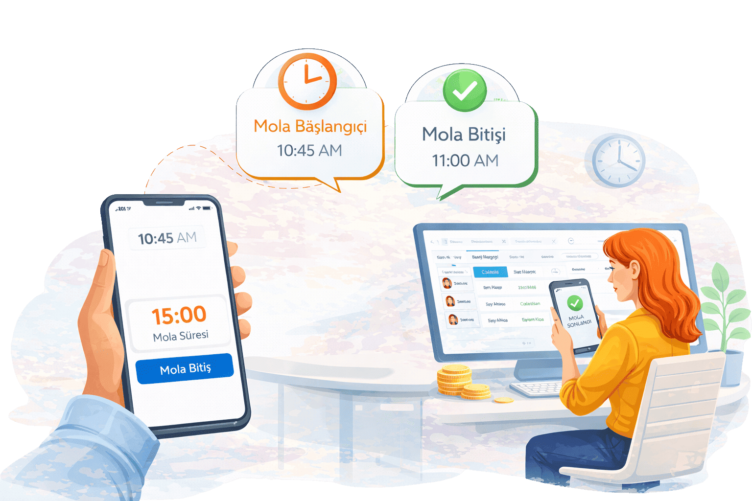 Personeller mola başlangıcı ve bitiş işlemlerini mobil uygulama üzerinden kolayca gerçekleştirebilir. Sistem mola giriş ve dönüş saatlerini otomatik olarak kaydeder. Böylece çalışanların mola süreleri şeffaf ve doğru şekilde takip edilir.