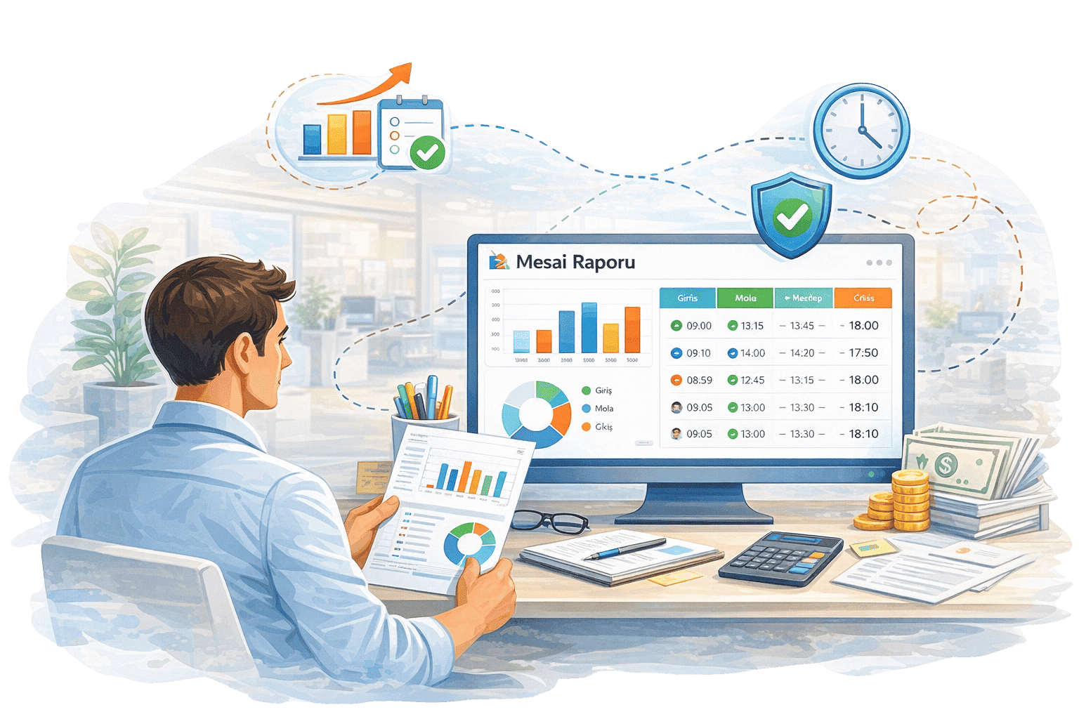 Tüm giriş, çıkış ve mola hareketleri sistem üzerinde kayıt altına alınır. Yöneticiler bu verileri raporlar üzerinden inceleyerek personel çalışma saatlerini analiz edebilir. Böylece bordro, vardiya ve operasyon yönetimi daha doğru ve verimli hale gelir.