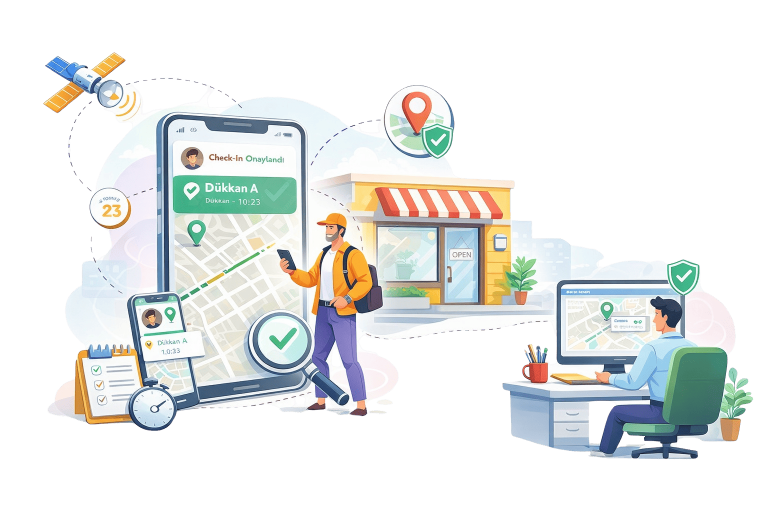 Emles mobil uygulaması üzerinden yapılan ziyaretlerde konum doğrulaması gerçekleştirilir. Böylece yöneticinin gerçekten ilgili mağazada bulunduğu sistem tarafından doğrulanır. Bu özellik saha operasyonlarının daha şeffaf ve güvenli şekilde yönetilmesini sağlar.