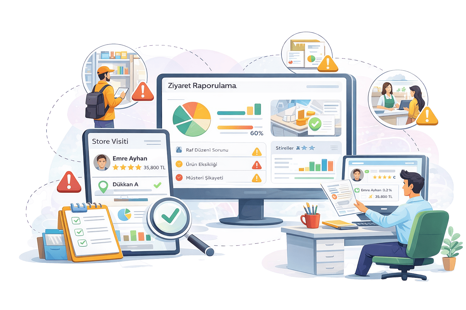 Mağaza ziyaretleri sırasında gözlemlenen tüm durumlar sistem üzerinde raporlanabilir. Bu raporlar sayesinde mağazalardaki operasyonel eksikler, satış süreçleri veya müşteri deneyimi ile ilgili konular hızlıca tespit edilir. Yöneticiler raporları inceleyerek gerekli aksiyonları alabilir ve saha performansını sürekli iyileştirebilir.