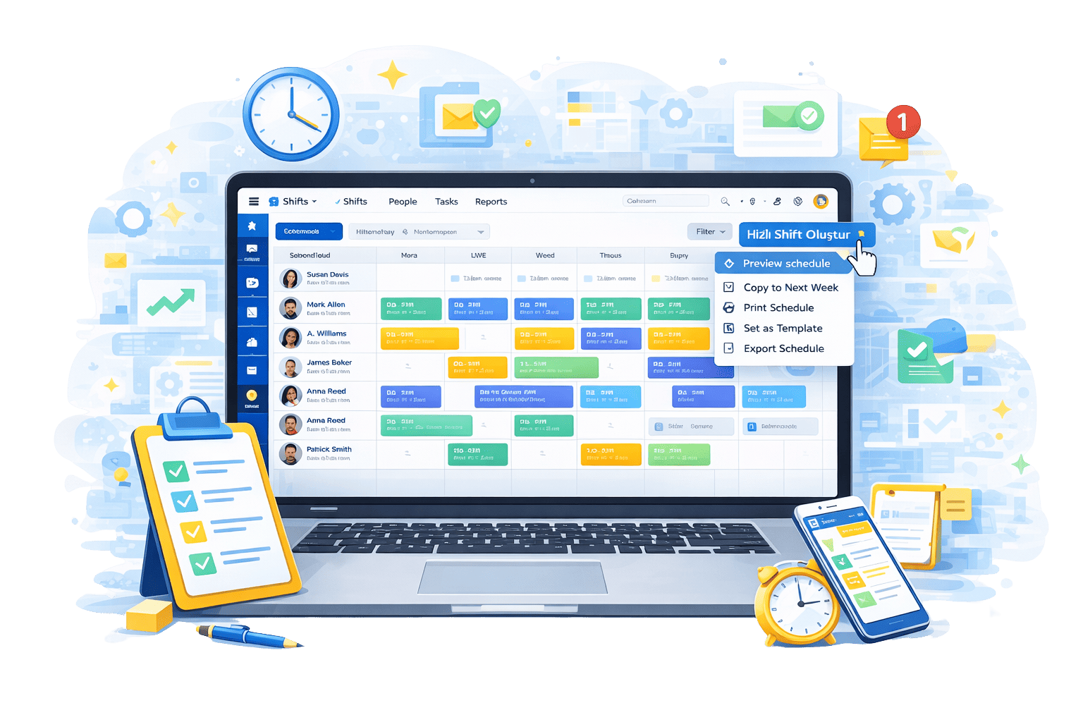 Hızlı shift parametresi sayesinde, vardiya planlarınızı çok daha hızlı, kolay ve verimli bir şekilde oluşturabilir, vardiya yönetiminizi daha pratik hale getirebilirsiniz.