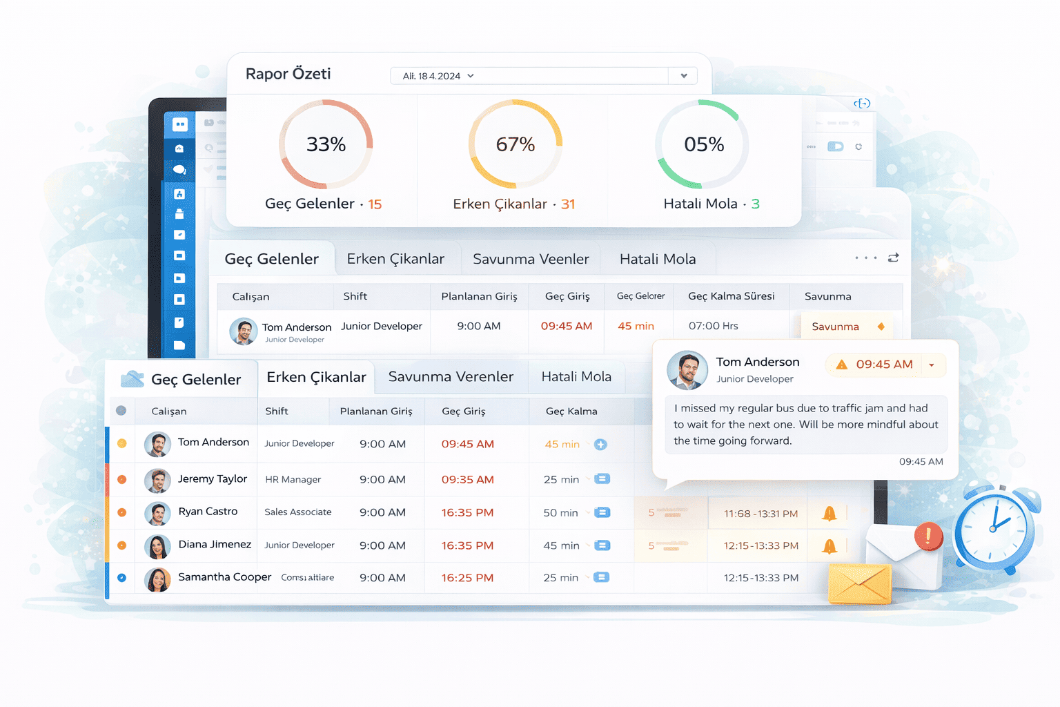 Günlük Shift Raporları üzerinden belirlenen tarih aralığında personelin giriş/çıkış hareketlerini, mesai saatine uyulmaması durumunda personel savunmasını görüntüleyebilirsiniz.